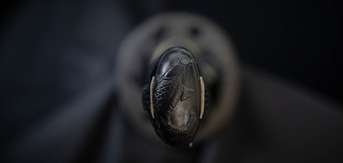 The koi kohaku is embossed on the fuchi (collar) and fuchi-kashira (pommel) and in the pierced, black round tsuba. The silver, wave menuki (handle ornaments) compliment the black tsuka-ito (handle wrap) and white same (ray skin). The wavy hamon (temper line) of the 27 1/2" forge steel blade echos the overall motif from kissaki (blade point) to the habaki (blade collar). A beautiful black lacquered saya with a buffalo horn kurikata (knob) is graced with a coral and white sageo (cord).